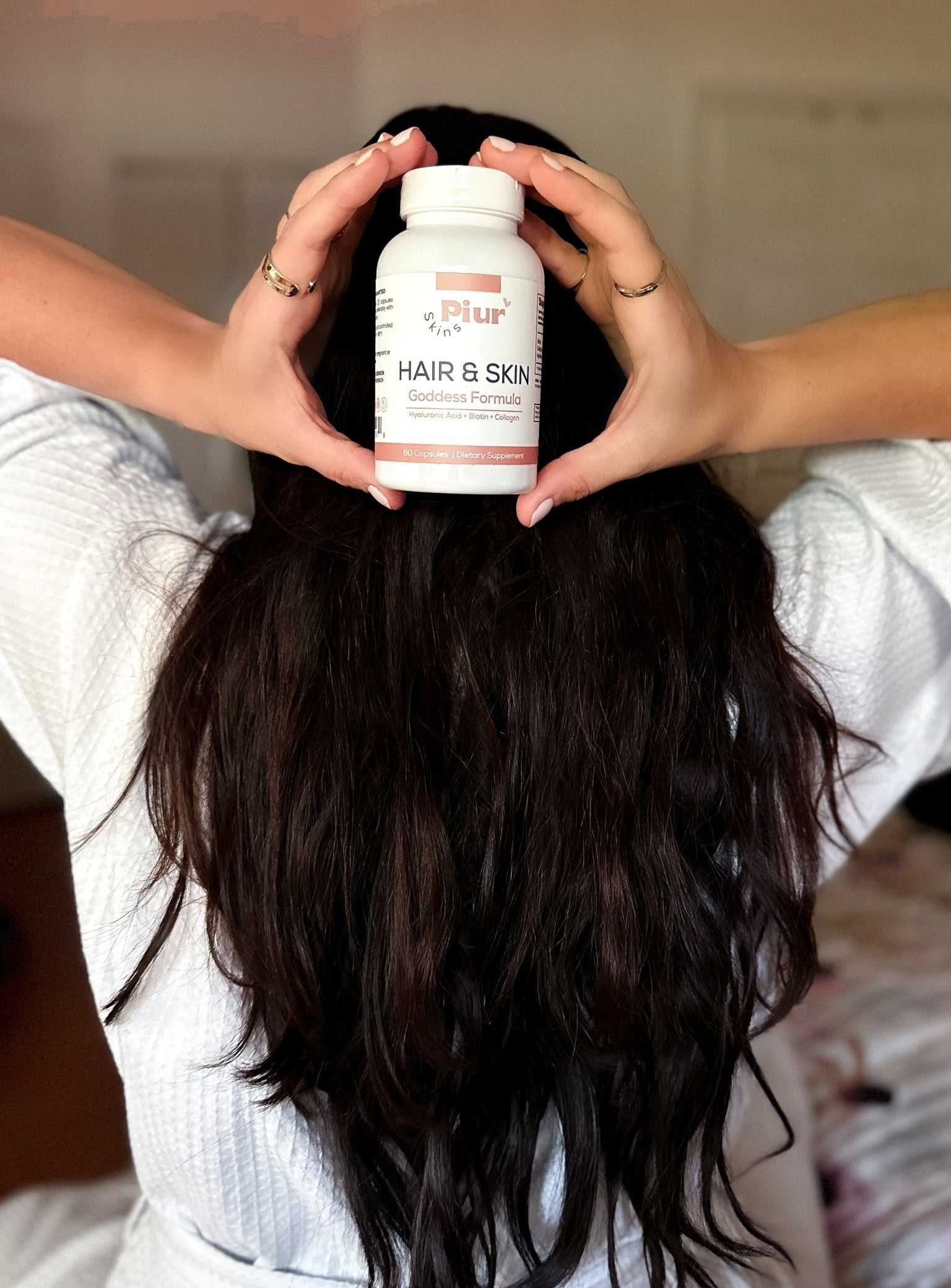 Strengthen your hair and rejuvenate your skin with our Hair & Skin Goddess Formula vitamins. Formulated with biotin, collagen, and hyaluronic acid, these daily capsules support natural hair growth and improve skin elasticity. Take two a day to boost hair strength, protect your roots, and add a natural glow – achieve healthier hair and skin from the inside out with consistent use.